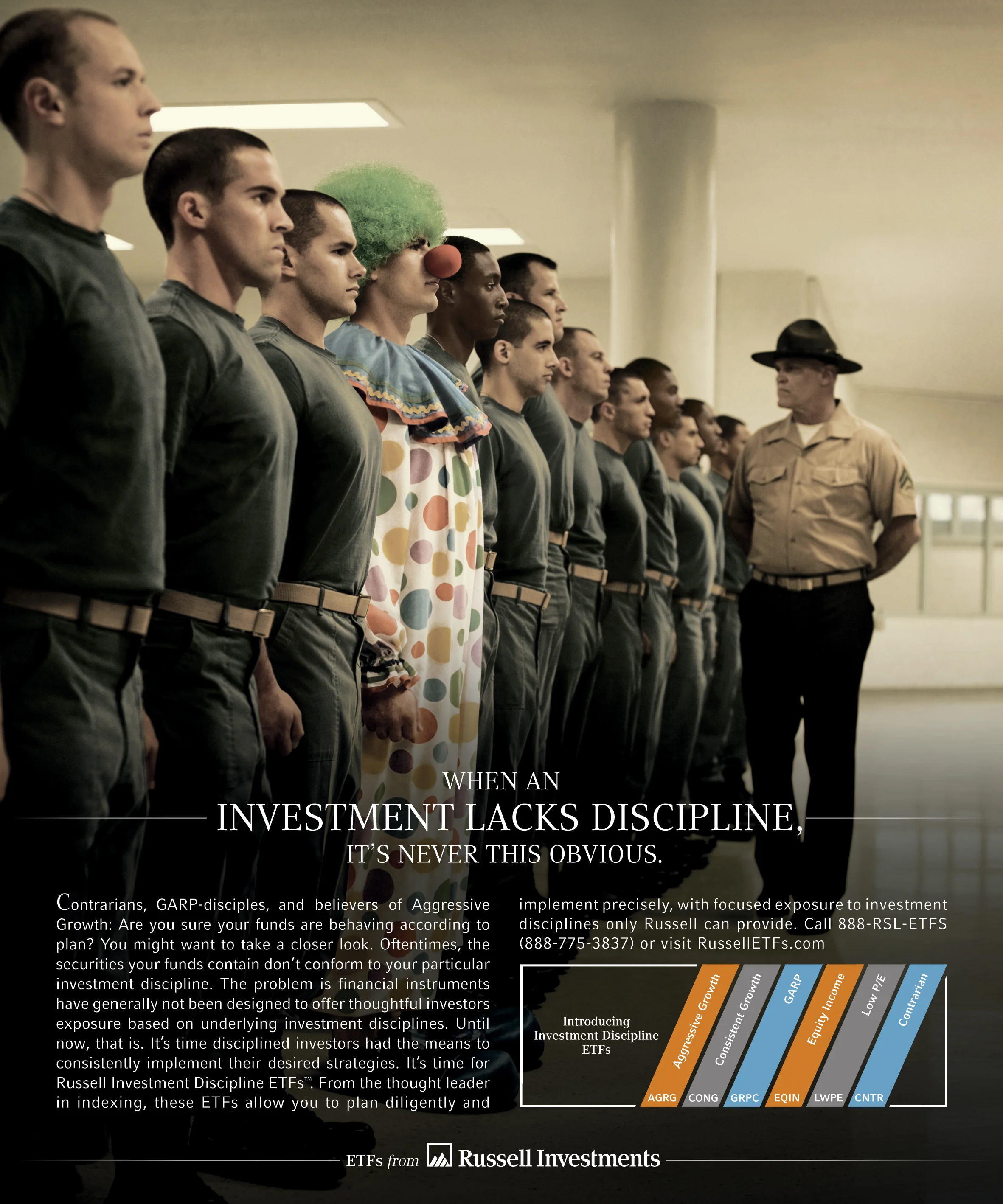The challenge here was taking a complex, rather heady subject and making it relatable and easy to understand. Even for investment advisors and experts in the industry, this line of products from Russell Investments was a whole new concept. No one in the financial world had approached exchange traded funds in this way before. So naturally, we turned to clowns and body builders to launch this new product line.